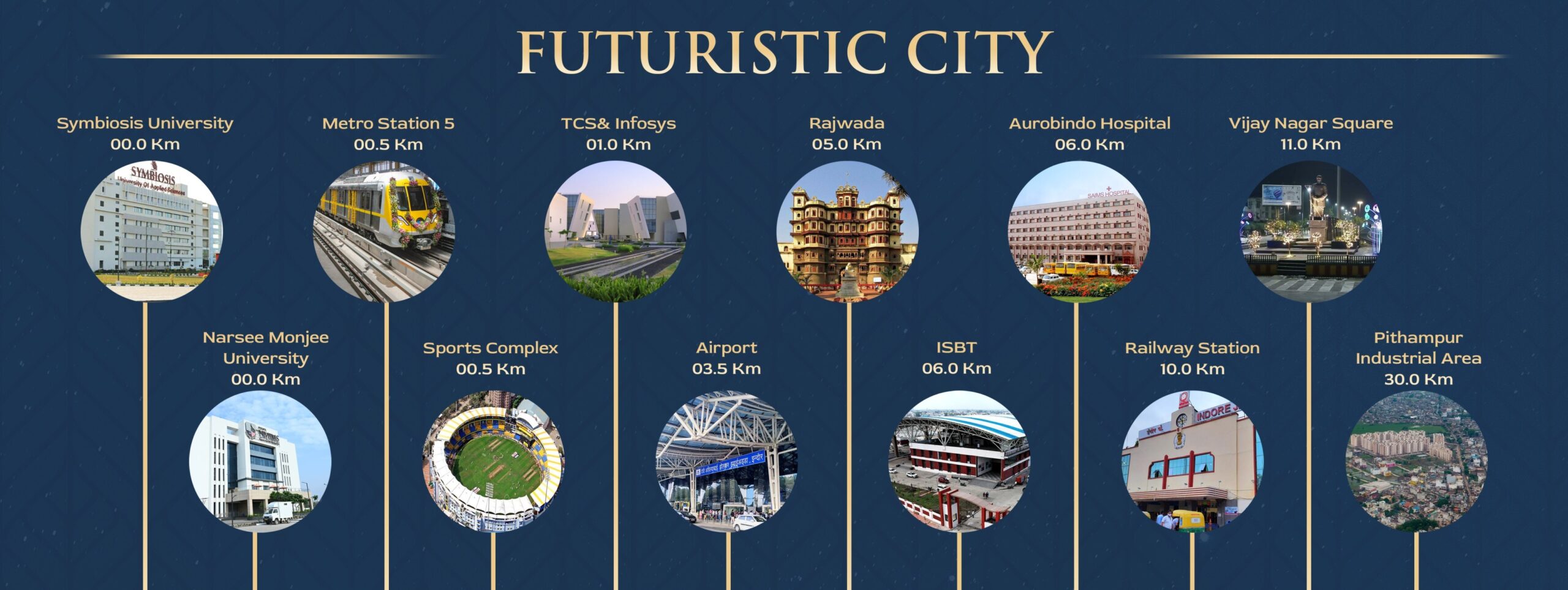 Vijay Nagar Square (11 km), Indore’s prime hub, and Pithampur Industrial Area (30 km), the city’s industrial powerhouse, are easily accessible.